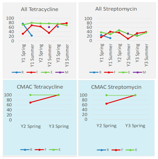 Percent of E. coli isolates phenotypically characterized as resistant to tetracycline and streptomycin, displayed by media from which they were initially isolated. MAC: n = 31, n = 293, and n = 120 for Rainfall Runoff (R), Feedlot Wastewater (F), and Excess Wastewater (E), respectively. For TMAC: n = 33, n = 293, and n = 141 for Rainfall Runoff, Feedlot Wastewater, and Excess Wastewater, respectively. For CMAC: n = 0, n = 26, and n = 5 for Rainfall Runoff, Feedlot Wastewater, and Excess Wastewater, respectively.