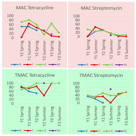 Up to three isolates were randomly selected per sample, for each of the three media types (MAC, TMAC, CMAC), streaked for isolation, and stored for antibiotic resistance gene (ARG) screening. Isolates were screened for the carriage of eleven tetracycline resistance genes, representing three tetracycline resistance mechanisms. Tetracycline resistance gene prevalence, by year, season, and sample type, is displayed in Figure 3. The prevalence of individual tetracycline resistance genes varied for all parameters observed. The tet(B) gene, was the most frequently detected gene in this sample set, followed by tet(L) and tet(C). Most targets (excluding tet(C) and tet(Q)) were more frequently detected in spring isolates, compared to summer isolates. When examining the results by sample type, individual ARGs were less frequently detected in the rainwater runoff samples than the feedlot wastewater and excess wastewater.