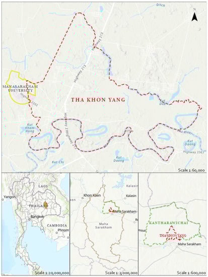 This paper focusses on the Tha Khon Yang Sub-district in the Maha Sarakham Province in the northeast of Thailand (Figure 1). Tha Khon Yang (TKY) comprises 15 villages. Maha Sarakham city has become an education hub with several universities and colleges, the largest being the Mahasarakham University. In the last two decades, five of the 15 villages of TKY have transitioned from rural to urban settlements. In the TKY, there are 8400 permanent and approximately 25,000 temporary residents (students or workers) []. As a result of the expansion of the Mahasarakham University accommodation and commercial enterprises have spread into the adjacent Khamriang Sub-district as well as the TKY. Urbanisation has had the combined effect of increased consumption of goods and concentrated the waste that is generated. In 2010 administrators of the Mahasarakham University, concerned with the increasing volume of waste produced within its campuses, created a zero-waste policy and implementation plan. This plan included additional waste management facilities and promotion of awareness of solid waste management approaches for their staff and students []. The Mahasarakham University introduced recycling banks, waste separation sites, and bio-fertilizer production from compost []. This reduced the volume of waste going to landfill by several tonnes per day. In 2015, the University was recognised by the Green University campaign for its commitment by achieving a place in the UI Green Metric World University Ranking [].
