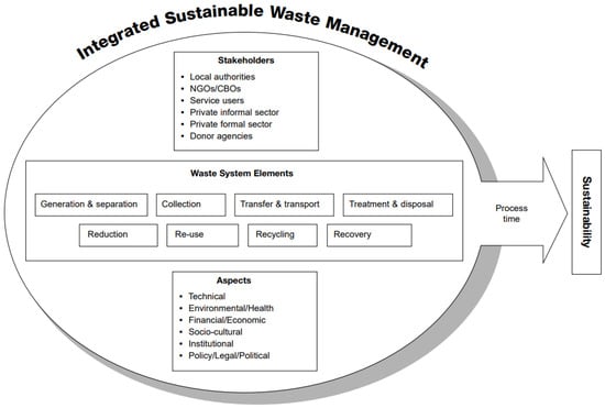ISWM theory recognizes three key components: the stakeholders affected by or engaged in waste management, physical or practical elements of the waste management system and an array of ‘aspects’ that directly affect waste management including political and cultural influences (Figure 2) [].