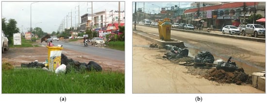 Typical scene of road-side waste in Tha Khon Yang. (a) Urbanized zone 1 (Observed 2/09/2015); (b) Urbanized Zone 2 (Observed 25/07/2016).