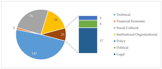 Thematic content of all of the quotes emerging from the unstructured and semi-structured interviews and the focus groups, categorised according to the categories of the ISWM (policy-legal-and political-based quotes are presented together in the pie chart and separated for clarity).
