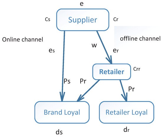 This study considers a two-echelon dual-channel supply chain coordination under cap-and-trade regulation. The supplier sells a certain product through online and offline channels. In the offline channel, that is a traditional retail channel, the supplier sells product at price , and in the online channel, the supplier sells product directly to consumers through Internet at price . Consumers are free to choose purchase channels. Some consumers prefer to purchase products only from the retailer, and the other purchase products from both the supplier and retailer. So they can be divided into two types, retailer loyal and brand loyal [30]. When the selling prices of online and offline are equal, we assume of brand loyal consumers prefer to purchase directly from the supplier, that is the initial proportion of brand loyal consumers preferring the online channel is , and the initial proportion of brand loyal consumers preferring the offline channel is . While some consumers will change their preference of purchase channel with price-sensitive parameter because of the gap of two channel selling prices [31]. We also assume that the supplier follows the “make-to-order” policy and the retailer follows the “lot-for-lot” policy, which are common assumptions in the literature on supply chain management. The main process of carbon emissions contains two parts, the production of supplier and procurement of two channels. The supplier is responsible for the emissions related to production and procurement in online channel, and the retailer is responsible for the emissions related to procurement in offline channel [32]. The dual-channel supply chain is illustrated in Figure 1. The major notations used in this paper are listed in Table 1.