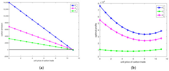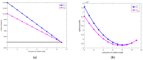 From Figure 2 we can find that cap-and-trade regulation could effectively reduce carbon emissions, and the higher the unit price of carbon trade, the more obvious the reduction is, but we should note that the unit price of carbon trade should not be too high. Moreover, we find that the optimal profit would decrease first and then increase. That is because the higher unit price of carbon trade could lead to fewer carbon emissions as shown in Figure 2a, and the firm would sell extra carbon credit to obtain profit.