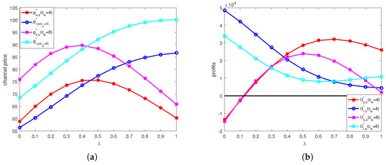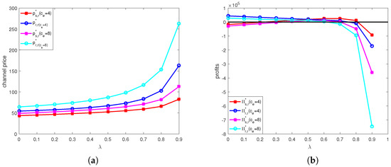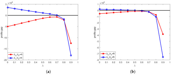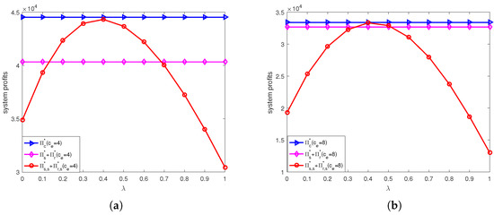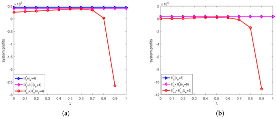 Figure 6 shows the coordination performance of online channel price discount contract under different unit price of carbon trade. From Figure 6a, we can see that when , the profit of decentralized system in online channel price discount is higher than that without coordination when , it means that this contract could improve supply chain performance; in particular, the system profit after coordination almost achieves the profit in the centralized system when . From Figure 6b, we can see that when , the profit of decentralized system in online channel price discount is higher than that without coordination when ; in particular, the system profit after coordination almost achieves the profit in the centralized system when . We also find that higher unit price of carbon trade reduces the scope of online channel price discount contract to achieve coordination. It means that it is difficult for online channel price discount contract to achieve coordination with a higher unit price of carbon trade.