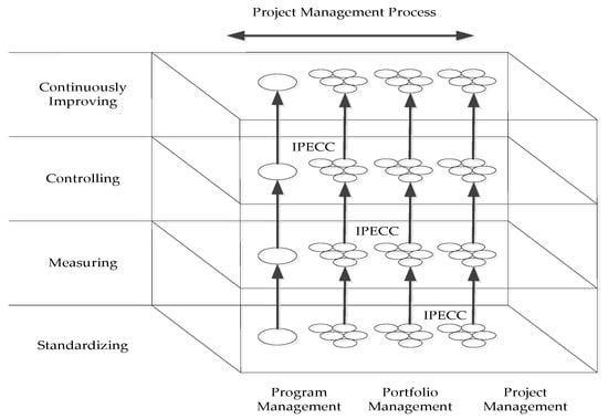 The theory of maturity was developed for software quality evaluation to evaluate the capability of software contractors and help software companies improve the maturity of process quality [52]. Since then, this theory has been used to evaluate the level of project management capability and attracted widespread attention from experts in recent years. More than 30 different types of project management maturity models have been proposed. Among them, the most well-recognized model is the Organization Project Management Maturity Model (OPM3) proposed by the Project Management Institute (PMI) [53], which presents advantages in the areas of evaluation systems, model frameworks and applications. The OPM3 was developed and established based on the results of extensive, in-depth and effective testing implemented in a number of representative organizations; therefore, the results possess a certain level of practical feasibility [54]. According to the PMI, the OPM3 can be divided into three dimensions as shown in Figure 1.