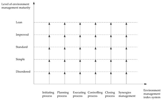According to the OPM3, the model should have three dimensions. However, in this paper, since the focus of our research is CP, the scope of project management is fixed according to the objective of the program. Therefore, the three dimensions of the environmental management Maturity Model of CP (EMMMCP) can be simplified into a two-dimensional model that includes the environmental management index system and the level of environmental management maturity as the dimensions. Then, as shown in Figure 2, the dimensions of the EMMMCP can be obtained.