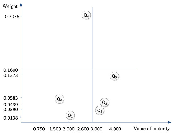 Moreover, the results indicate that although the initiating and controlling processes are at the same level overall, their individual levels of maturity and the weights between them are very different. Thus, further analysis of the results is necessary to understand how to improve the level of environmental management maturity. Therefore, the maturity level and index weights are selected as the dimensions of analysis in this paper. Averaging the weights of these 6 indexes yields 0.16 as the critical value for dividing the ordinate quadrant, and an average maturity level of 3 as the critical value for dividing the abscissa quadrant. Then, the results can be displayed through a four-quadrant approach as shown in Figure 3.