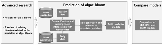 In this study, we aimed to identify the cause of harmful algal blooms and construct a suitable prediction model to facilitate preemptive action. We used ordinary least square (OLS) regression with the MLP, RNN, and LSTM models to build our prediction model. The study’s three-stage framework is shown in Figure 1.