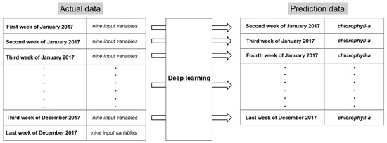 To compare the prediction values between models, 60% of the data were used as training data, 20% as validation data, and 20% as test data. Figure 3 shows the prediction process, in which predicted chlorophyll-a (t point) was a predictor variable for the learning of nine variables in one week (t-1 point). One week in advance was chosen as the prediction timescale for algal blooms because it showed the best balance between prediction accuracy and an effective prediction period for preventing algal bloom damage. The test data were used to predict chlorophyll-a and compare with existing data. The RMSE was used as an evaluation index by comparing the predicted value with the actual value: