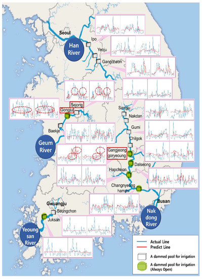 Furthermore, our results showed the potential for using a deep learning model when it is difficult to apply existing physical prediction models (such as QUAL2E and CE-QUAL-W2) due to a lack of data on the relationships between factors. Applying deep learning methodology to water quality and environment management studies can improve the prediction accuracy by constructing a short-term prediction model for algal blooms. The performance of the LSTM model can achieve better predictions, one week in advance that would enable the implementation of specific and appropriate measures for the prevention or mitigation of algal blooms.