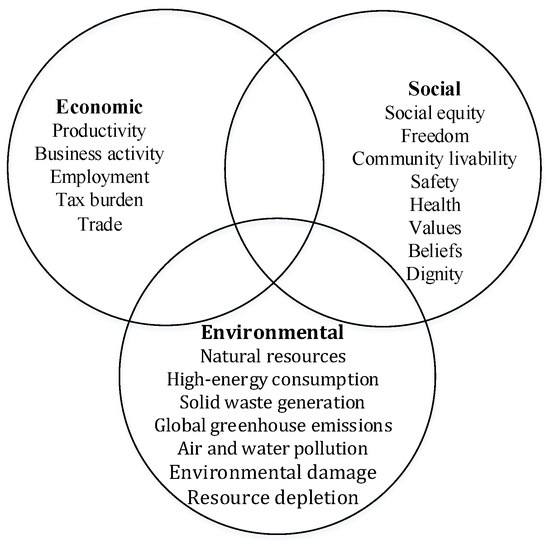 For the sake of generating a balance of economic, environmental, and social impacts, sustainable transportation has been proposed in many prior studies [24,25]. Kennedy et al. indicate that the proper establishment of four pillars—the effective management of land use and transportation; equitable, efficient, stable funding; strategic infrastructure investments; and attention to neighborhood design—are required to achieve more sustainable transportation in the process [26]. Many prior studies have focused on the environmental and economic aspects of SDGs for transportation projects. Xue proposed that environmental sustainability be emphasized to prevent unnecessary consumption of natural resources (especially non-renewable ones) and mitigate high-energy consumption, solid waste generation, global greenhouse emissions, external air and water pollution, environmental damage, resource depletion, etc. [8]. Economic sustainability cares more about productivity, business activity, employment, tax burdens and trade. It strives not simply for material wealth (increased quantity) but also for social welfare outcomes (increased quality) [27]. Meanwhile, social sustainability is also an important part of the sustainable development of transportation [25]. However, the social dimension of sustainable development is widely accepted, which means, to be exact, that there is no clear definition or consent. Usually, narrowly defined social sustainability pays attention to social equity, freedom, community livability, safety, people’s health, values, beliefs, dignity, perceptions about society, etc. [27,28]. The concepts of social safeguarding, social capital, social protection, social value, social cohesion, social inclusion and social exclusion, which overlap, always connect with a broader concept of social sustainability [29]. As shown in Figure 1, each dimension of SDGs can be divided into a specific category. However, these three dimensions can overlap with each other [27]. For example, air pollution impacts the environment (environmental sustainability concerns), which also affects people’s health (social sustainability concerns) and living costs (economic sustainability concerns). Moreover, according to the aforementioned concepts, the goals of sustainable development (i.e., SDGs) of transportation PPP projects should integrate the economic, environmental, and social impacts at the same time [25,27].