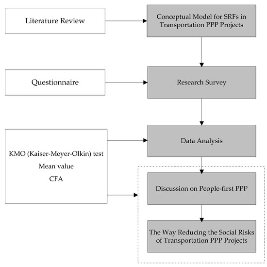 A hybrid research method was employed in this study, as shown in Figure 2. First, based on a review of previous research results, a conceptual model is proposed using the theory of sustainable development. In addition, the potential SRFs that could lead to the social risks of transportation PPP projects are identified according to the proposed conceptual model. Then, a questionnaire was conducted to collect data to investigate the significance of the identified SRFs for transportation PPP projects. Based on the data collected from the survey, the SRFs were tested using multiple statistical analyses and the mean value to validate the survey results and evaluate the perceptions of SRFs. Confirmatory factor analysis (CFA) was further performed to test whether the theoretical model was consistent with the survey data and the relationship between SRFs was clearly defined. In addition, the contribution to the generation of different SRFs and SRF dimensions is discussed based on the significance level and factor loadings. CFA is aimed at not only detecting and explaining SRFs but also improving the present state of SRF management in actual transportation PPP projects and developing helpful social risk management in PPPs for future use. Furthermore, a people-first PPP method to reduce social risks is proposed to enhance the social sustainability of PPPs and achieve the SDGs of transport system.