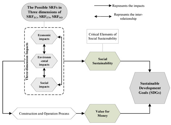 As mentioned above, social sustainability is an important part of the SDGs of transportation [25], and the sustainable development of transportation PPP projects should integrate economic, environmental, and social impacts at the same time [25,27]. Thus, these impacts can affect social sustainability from different perspectives. In addition, for a transportation PPP project, the ultimate objective is to achieve VfM (Value for Money) for a public service and product. The definition of VfM is the maximum achievable outcome from the development of a transportation PPP project [43] In a new built transportation PPP project, the VfM objective should reflect the government’s overall strategic plan and mission objectives, the private sector’s long-term development and payoff strategy, and the general public’s requirements of quality public facilities and services [44]. Therefore, the achievement process of VfM for transportation PPP projects can also be affected by economic, environmental, and social impacts. Overall, the pursuit and realization of social sustainability and VfM should be closely related to economic, environmental, and social impacts. Because sustainable development is the final goal of transportation projects, these three impacts can affect the realization of SDGs through their effects on social sustainability and the VfM of the projects.
