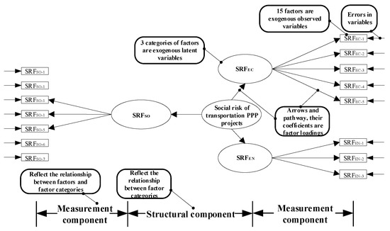 The hypothesized model, as shown in Figure 4, was built to compute the population covariance matrix, which was compared to an observation covariance matrix when the CFA was conducted. The above SRF model was verified by using CFA to remove unimportant indicators. The SRFs that had low factor loadings (contribution to the social risk) were removed to achieve the optimal model, through which key SRFs could be identified. In addition, many SRFs (e.g., SRFEC-3 and SRFEC-4), as mentioned before, may have economic and social impacts on the change of social value or social sustainability for transportation PPP projects at the same time. CFA can help to test which factors should belong to which dimensions by finding an optimal model according to statistical analysis.