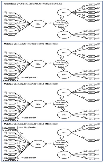 Following the CFA, the variables and the errors among the variables are presented in Figure 5. Four models are presented, including the initial model, model 1 (moving SRFEC-3 to the SRFSO dimension), model 2 (moving SRFEC-4 to the SRFSO dimension), and model 3 (moving SRFEC-3 and SRFEC-4 to the SRFSO dimension). As presented before, SRFEC-3 and SRFEC-4 can affect both the economic and social dimensions of the social sustainability of transportation PPP projects in China. CFA can help to test which relationship is better. The coefficients of the arrows and pathway (factor loadings) as shown in Figure 5 can present the causal effect statistically and in terms of the relationship of the SRF dimensions and SRFs influencing the social value and social sustainability of transportation PPP projects in China by the proposed model. The measurement and structural components are also shown in Figure 5, illustrating that the model reflects the relationships of the factors and factor packages directly.