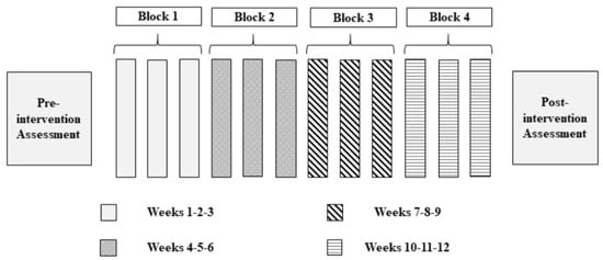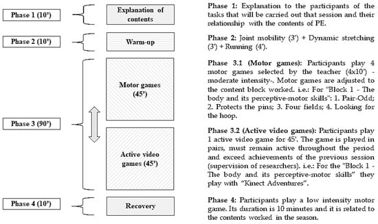 It was expected to obtain a similar internal load through motor games and active video games, since as Miyachi et al. [] state, these can involve physical activity of a moderate intensity. The splitting of the group was done as a result of the impossibility to work with active video games with the whole group at the same time, due to the high amount of devices required. The arrangement of the intervention sessions is shown graphically in Figure 2.