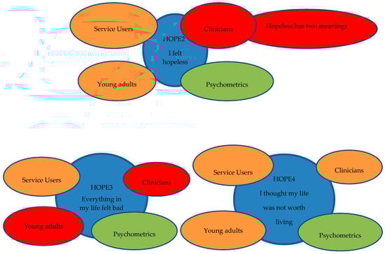 Combining qualitative with quantitative evidence (theme: hope; subtheme: hopelessness). blue: Item; green: Positive views/properties; orange: Mixed views/properties; red: Negative views/properties.