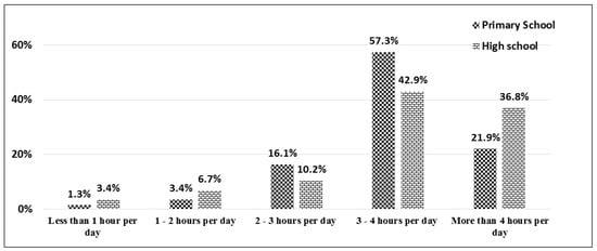 Among the sample population, 57.3% of primary school students and 42.9% of high school students use social media 3–4 h per day. Moreover, 21.9% of primary school students and 36.8% of high school students use social media more than 4 h per day. In general, 79.2% of primary school students and 79.7% of high school students use social media more than 3 h per day (Figure 2).
