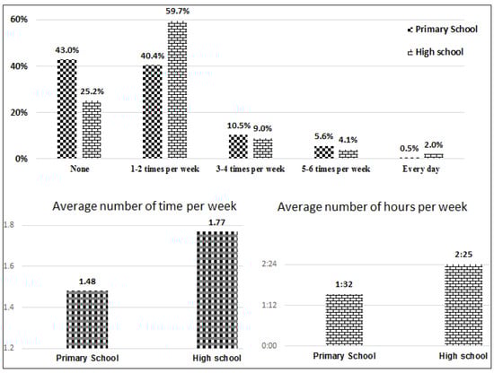 From 958 primary school students, 43% do no physical activity, 40.4% do physical activity 1–2 times per week, 10.5% do 3–4 times per week, 5.6% do 5–6 times per week, and only less than 1% do physical activity every day. However, among high school students, 25.2% do not exercise, 59.7% do so 1–2 times per week, 9% do 3–4 times per week, 4.1% do 5–6 times per week and around 2% do exercise every day (Figure 3).