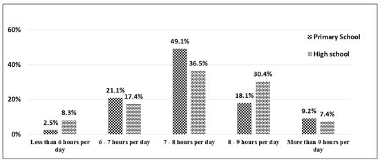 Based on Figure 4, most primary school students (49.1%) and high school students (36.5%) get 7–8 h of sleep per day. More than 18% of primary school students get 8–9 h of sleep per day. However, among high school students, more than 30% get 8–9 h of sleep per day.