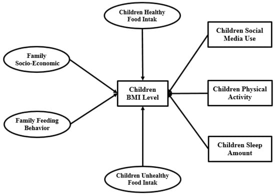 Iran has been facing the problem of child obesity and overweight in the last two decades. A study by Soltani et al. [] demonstrated that more than 18% of children in elementary school (6–11 years old) exhibit the highest prevalence and risk of obesity and overweight. The challenges of obesity and overweight during childhood and the teenage years have negative and dangerous ramifications for premature mortality and morbidity as well as physical disability later in adulthood []. The association between obesity/overweight and eating habits while watching television was studied by Ghobadi et al. [] in Iran. Unfortunately, there are very few studies in Iran that investigate the impact of child behavior like technology use, average sleep time and physical activity considering the family environment and especially the family socio-economic status, child-feeding behavior and children’s BMI level. Nevertheless, research on the simultaneous integration of the interrelationships among three well-known concepts, i.e., family socio-economic status, family child-feeding behavior and children’s healthy and unhealthy food intake into one model remains scarce.