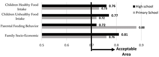 Figure 6 represents the Cronbach’s alpha outputs of four latent variables for both primary and high school. Evidently, all indices are higher than 0.7. Therefore, the research model validity is accepted.