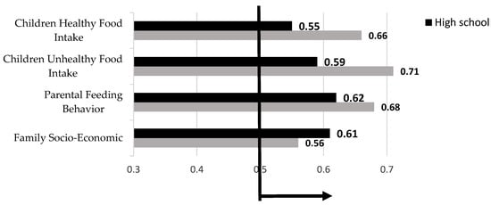 Kröller and Warschburger [] introduced seven factors to measure the food intake of children, which is divided into two groups: healthy and unhealthy food intake. This concept was applied in the present work to measure the food intake of children. Healthy food intake includes the consumption of whole grain products (including whole grain rice, pasta, bread, and cereals), fruits (including all kinds of unsweetened fruits, frozen or fresh) and vegetables (including frozen, dry or fresh), whereas unhealthy food intake entails the consumption of fast food (e.g., hot dogs, pizza, and burgers), chips (e.g., nuts, chips, and pretzels), soft drinks (including all types of sweetened beverages) and sweets (e.g., cookies, candies, chocolate, and cake). Every indicator was measured using a five-point scale. The responses obtained were coded as 1 for ‘never’, 2 for ‘rarely, 3 for ‘sometimes’, 4 for ‘mostly’ and 5 for ‘always.’