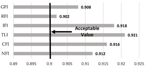 Figure 8 shows the output of SEM model fitting. The goodness of fit index (GFI), relative fit index (RFI), incremental fit index (IFI), Tucker Lewis index (TLI), comparative fit index (CFI), and normed fit index (NFI) values are within acceptable ranges.