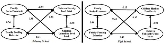 Table 4 presents the factor loadings of children’s healthy food intake, children’s unhealthy food intake, family socio-economic status and family child-feeding behavior in both primary and high school models.