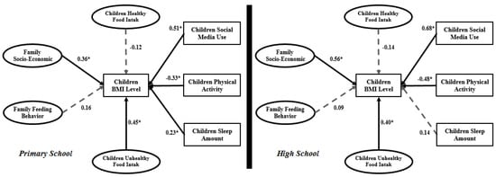 Figure 5 illustrates the SEM research framework for both primary and high school students. Seven factors are considered as research model inputs. Four factors including children’s healthy food intake, children’s unhealthy food intake, family socio-economic status and family child-feeding behavior are latent constructs. The remaining factors, including children’s social media use, children’s physical activity and children’s sleep amount are measurement structures.