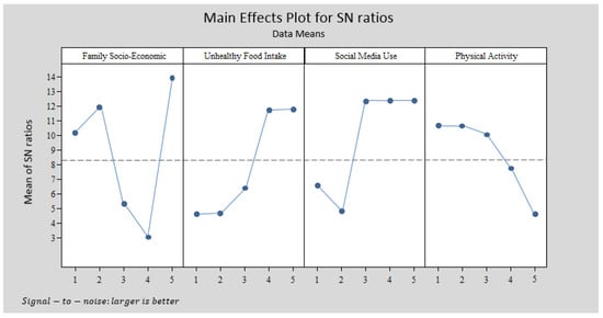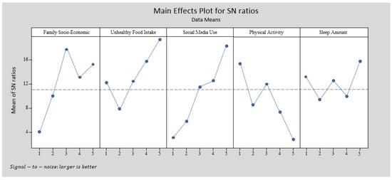 The outputs from the first section were used in the second section. Based on the SEM analysis outputs, the significant variables in obesity modeling were extracted and the Taguchi experiment was designed. The primary school model involved family socio-economic status, children’s unhealthy food intake, children’s social media use, children’s physical activity and children’s sleep. For the high school model, the family socio-economic status, children’s unhealthy food intake, children’s social media use, and child sleep amount were extracted (Figure 10). L25 (55) and L20 (45) were designed for the primary school and high school patterns. Figure 11 illustrates the MINITAB software output according to the Taguchi method design for primary schools. This figure represents a pattern which indicates that families with moderate socio-economic status and with children who always have unhealthy food intake, use social media more than 4 h per day, have no physical activity and sleep more than 9 h per day have children with the highest BMI. This pattern differs for high school students. The highest BMI in the high school pattern (Figure 12) is experienced by families with very high socio-economic status and with children who mostly or always eat unhealthy food, use social media 2–3 h per day or more, and have no physical activity or only once per day.
