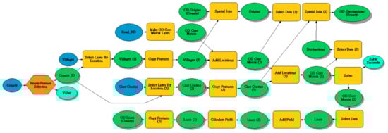 It is a complicated task to account for disparities in spatial relationships between the supply and demand sides. Thus, in this study, six accessibility measurements were evaluated to estimate levels of geographic accessibility from 7681 villages and 1941 elderly community care centers in Taiwan in 2017, taking into account both accounting factors of distance and the amount of community care centers, as well as supplier’ points (supplier loading) (Table 1). The ESRI ArcGIS 10.5.1 (Esri, Redlands, CA, USA) “Model Builder” tool incorporated with the “Network Analyst extension” module and SQL programming from Microsoft SQL Server 2014 (Microsoft, Redmond, WA, USA) were used to calculate the accessibility measures.