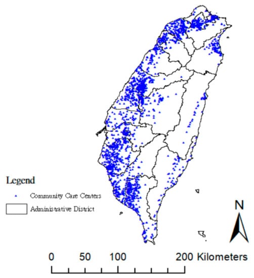 Neighborhood was primarily operationalized using census-defined boundaries. Recent studies on neighborhood and health for the elderly were identified []. According to the Taiwanese government’s long-term care policy (“Long-Term Care 2.0”) [], the service population is defined as individuals 65 years and older, and the total solution of community care framework is based on the village-level for the goal of “aging in place.” Thus, in 2017, the demand population for this study comprised 3,148,283 individuals. The study area covered 19 counties, 349 townships, 7681 villages, and 1941 community care centers in Taiwan (Main Island).