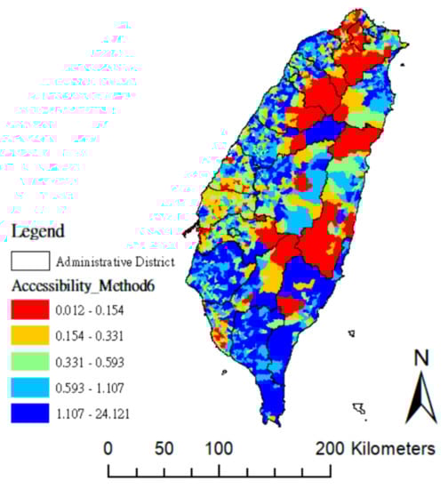Walkability is a measure of how friendly an area is to walking. Often, the elderly are disadvantaged in terms of mobility; thus, method M6 is based on the same concept as method M5, but also accounts for elderly walkability. The walkable accessibility of community-based care resources can improve the elderly’s health and aging in place. Although walking seems like a simple activity, it is actually a complex symphony involving many of the body’s systems, whereby our bodies must coordinate balance, muscle contraction, and relaxation, as well as adjust the cardiovascular system. Therefore, a friendly, community-based elderly care center should consider the elderly’s neighborhood walkability and physical abilities [,]. The appropriate walking speed for older pedestrians is 0.91 m/s []. Method M6 accounted for village population and supplier loading in calculating the accessibility of the nearest distance-decay. Method M6 presents a more realistic measure of accessibility, because it considers the elderly’s walkability and care in village-level neighborhood. Method M6 set 3 km as the appropriate nearest supplier’s distance. Considering that the elderly may decrease walking speed to rest, method M6 estimated about 60-min of walking time, and the nearest supplier’s road distance to the elderly was determined to be within 3 km. The distance-decay weight was set to one when the distance is within 3 km, and inversely varies the nearest distance after 3 km.