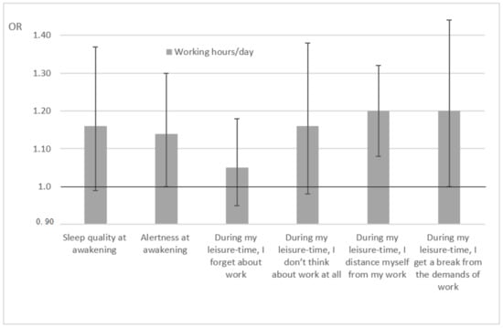 Odds ratios (OR) for association between working hours/day and ratings of sleep quality and alertness, and recovery and detachment (midsleep time accounted in the analysis). Error bars indicate 95% CIs.