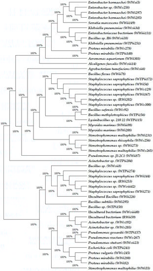 In total, 254 bacterial isolates were obtained from the water samples on non-selective media: 183 from WW samples, 33 from WTP samples and 38 from the RW samples (Table 2). Phylogenetic groups were determined for each bacterial sequence obtained from this study (Figure 1) with high similarities (99–100%) to known species based of BLAST (National Centre for Biotechnological Information (NCBI). The result shows that the environmental isolates in this study belong to at least 16 different genera and unculturable group (Table 2). The 16 genera are Acinetobacter, Aeromonas, Agrobacterium, Alcaligenes, Bacillus, Enterobacter, Enterobacteriaceae, Escherichia, Klebsiella, Lysinibacillus, Myroides, Proteus, Pseudomonas, Serratia, Staphylococcus, and Stenotrophomonas. The majority of the organisms obtained belong to the bacterial division Gammaproteobacteria (66.6%). The other bacterial isolates belong to the bacterial division Alphaproteobacteria (0.8%), Betaproteobacteria (0.4%), Firmicutes (25.2%), Bacteroidetes (3.9%) and the unculturable group (3.1%). The most prevalent species were the Proteus mirabilis isolates, followed by Acinetobacter sp. and Enterobacter sp. Figure 1 shows the Neighbor-joining Phylogenetic tree of the bacterial isolates from the WW, WTP and RW.