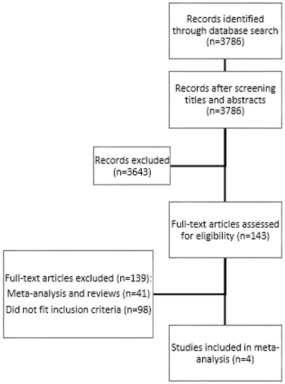 A total of 3786 records were identified through this search. Out of these, 143 full-text articles were assessed for eligibility. In total, four articles complied with the inclusion criteria [38,39,40,41]. These studies included 934 women using antidepressive agents and 5767 non-using individuals (Table 1).