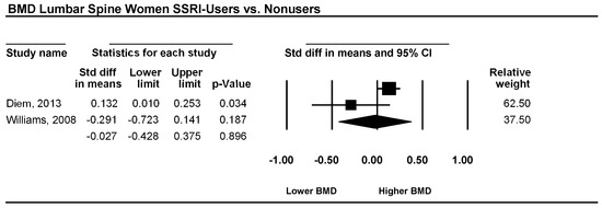 Two studies examined the lumbar spine in patients using an SSRI as the antidepressive agent versus a non-using control group. The pooled effect sizes for women, corresponding CI, p-values, and relative weights for each study and a forest plot summarizing the association between depression and BMD are shown in Figure 2. The effect sizes ranged from −0.29 to 0.13, with one study reporting either lower or similar BMD and one study showing higher BMD. However d, was −0.03, and its CI was between −0.43 and 0.38. This result implies that overall BMD is not significantly lower in women using SSRIs than in non-using women (p = 0.896). The heterogeneity was very low (I2 = 0).
