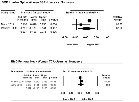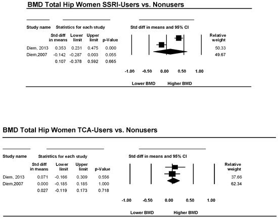 Two studies examined the total hip bone mineral density in patients using an SSRI as an antidepressive agent versus a non-using control group. The pooled effect sizes for women, corresponding CI, p-values, and relative weights for each study and a forest plot summarizing the association between depression and BMD are shown in Figure 4. The effect sizes ranged from −0.14 to 0.35, with one study reporting either lower or similar BMD and one study showing higher BMD in patients using SSRIs. However, d, was 0.11, and its CI was between −0.38 and 0.59. This result implies that overall BMD is not significantly lower in women using SSRIs than in non-using women (p = 0.665). The heterogeneity was very low (I2 = 0).