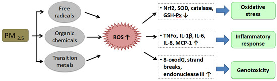 PM2.5 is closely related to adverse health outcomes. The potential mechanisms of the impact of PM2.5 on the pathogenesis of diseases include oxidative stress, inflammatory responses, and genotoxicity (Figure 1). PM2.5-induced reactive oxygen species (ROS) have been regarded as a crucial mediator of PM2.5 toxicity [11,12,13]. Organic compounds and free radicals generated from combustion sources could be connected with PM2.5. Reactive electrophilic metabolites are the electrophilic messengers for ROS that activates ROS through redox cycling and metabolic activation. [14,15,16,17,18,19,20]. Transition metals, such as Mn, Vn, Cu, and Fe, coated to PM2.5 and the resulting Fenton reaction produces intracellular ROS. Oxidative stress can be induced by increasing ROS, which impairs the antioxidant system by decreasing the nuclear factor, erythroid-2-related factor 2 (Nrf2) [11], and reducing the antioxidant ability of the cells by reducing antioxidant enzymes, such as superoxide dismutase (SOD), glutathione peroxidase (GSH-Px), and catalase [21,22,23]. PM2.5 induces the activation of inflammatory cells, which can produce ROS due to the generation of oxidative stress in cells [24,25].