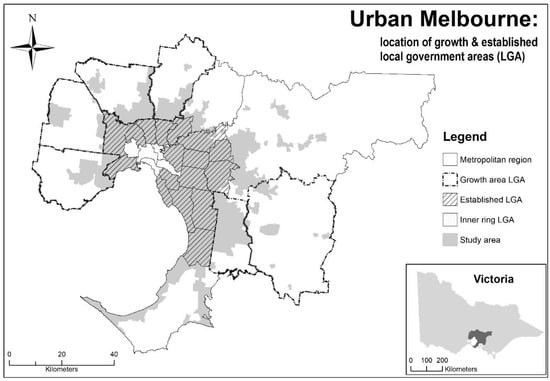 In Australia, many studies have investigated associations between food outlet access and dietary or health outcomes in urban [] and regional areas []; however, little is known about food environments across established residential and urban-growth areas within cities. In the context of rapid urban growth, it is important to understand how patterns of suburban development influence local food environments and health outcomes. In the decade up to June 2016, more than three-quarters of Australia’s population growth was concentrated in capital cities, with Melbourne in the state of Victoria accounting for the largest growth []. Within Melbourne, local government areas on the fringe experienced some of the largest and fastest growth, and this trend is projected to continue []. At the same time, the delivery of infrastructure and services in new residential developments lags behind population settlement by many years []. Uneven suburban development across established and urban-growth areas of Melbourne may influence food environments and health outcomes; however, this is an understudied research area in an Australian context. A more nuanced understanding at the intra-city level has potential to guide and target urban design and planning policy interventions to specific geographic areas where health and access inequities exist [].