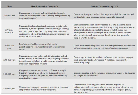 Overview of camp programming provided at the health promotion cohort (Colorado, CO) and the obesity treatment cohort (Wisconsin, WI). Total time spent in physical activity: 2–3 h (CO); 2–4 h (WI). N/A: not applicable.