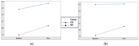 Visualization of differing changes in exercise and healthy eater role-identity between the Colorado (CO; health promotion) and Wisconsin (WI; obesity treatment) camps: (a) The magnitude of change from baseline to post-camp (Post) in ERI in the obesity treatment cohort appears greater than in the health promotion cohort; (b) An increase in HERI was observed in the obesity treatment cohort versus a plateau in HERI in the health promotion cohort (Baseline to Post).