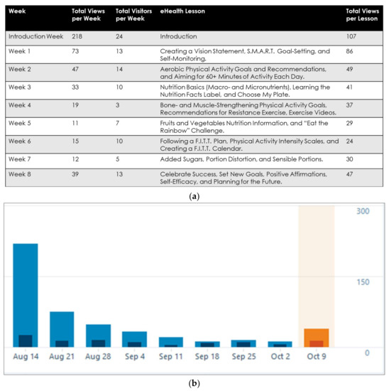 Overview of the eHealth program weekly lessons and webpage traffic: (a) total weekly views and visitors to the eHealth program peaked within the first few weeks; S.M.A.R.T. Goal-Setting denotes specific, measurable, attainable, realistic, and time-bound goals; F.I.T.T. Plan denotes frequency, intensity, type, and time chosen by the camper for physical activity participation (b) viewership and participation in the eHealth program peaked in the introductory week and dropped to a plateau throughout the eight-week curriculum; transparent bars represent total weekly views and opaque bars represent total weekly webpage visitors (the orange bar represents the final week of the eHealth program).