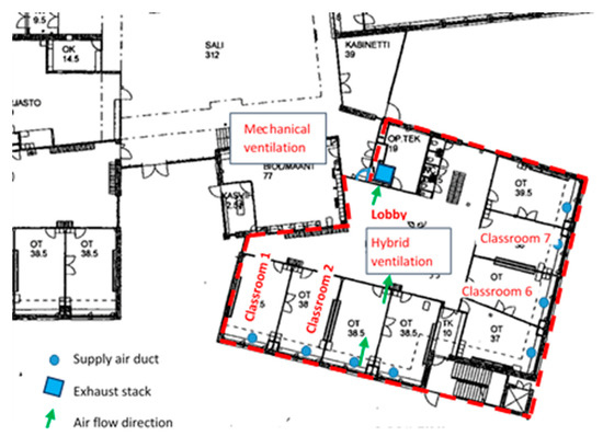 This study focused on one hybrid-ventilated section of the building, which consisted of two equal areas in the first and second floor, was served by one air handling unit and occupied by approximately 30% of the school teachers and students. Occupants had reported the most severe symptoms and discomfort in the studied section, especially in the first floor. The studied section consisted of a first floor lobby surrounded by eight classrooms and toilets. The layout is presented in Figure 1.