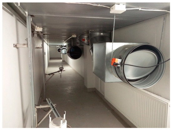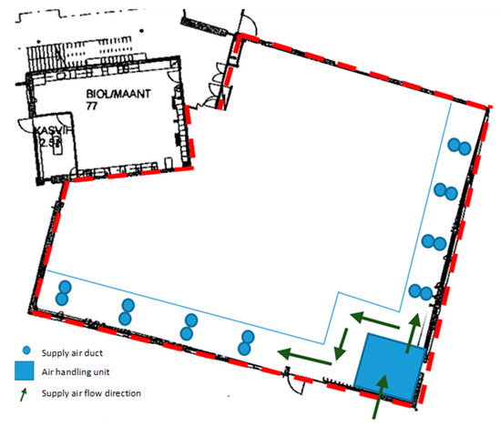 After the air handling unit, supply air entered a chamber with two corridors, where it was heated with radiators. The cross-section area of the corridor space was 2 m2. Each classroom of the building section (altogether, 16 classrooms on two floors) had its own supply air duct beginning from these underground corridors. The layout of the supply air corridors and their location in relation to the section of the building under study are shown in Figure 2.