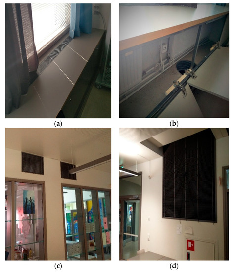 (a,b) Supply air grill and duct in the classrooms; (c) transfer air grilles in the partitions between classrooms and the lobby and (d) exhaust stack in the lobby.