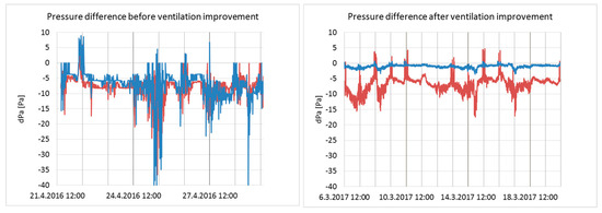 Pressure differences across the building envelope in Classrooms 1 and 2 before and after the ventilation improvement are shown in Figure 5.