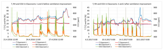 The T, RH, and CO2 of indoor air before and after the ventilation improvement during the entire measurement period are presented in Figure 6.